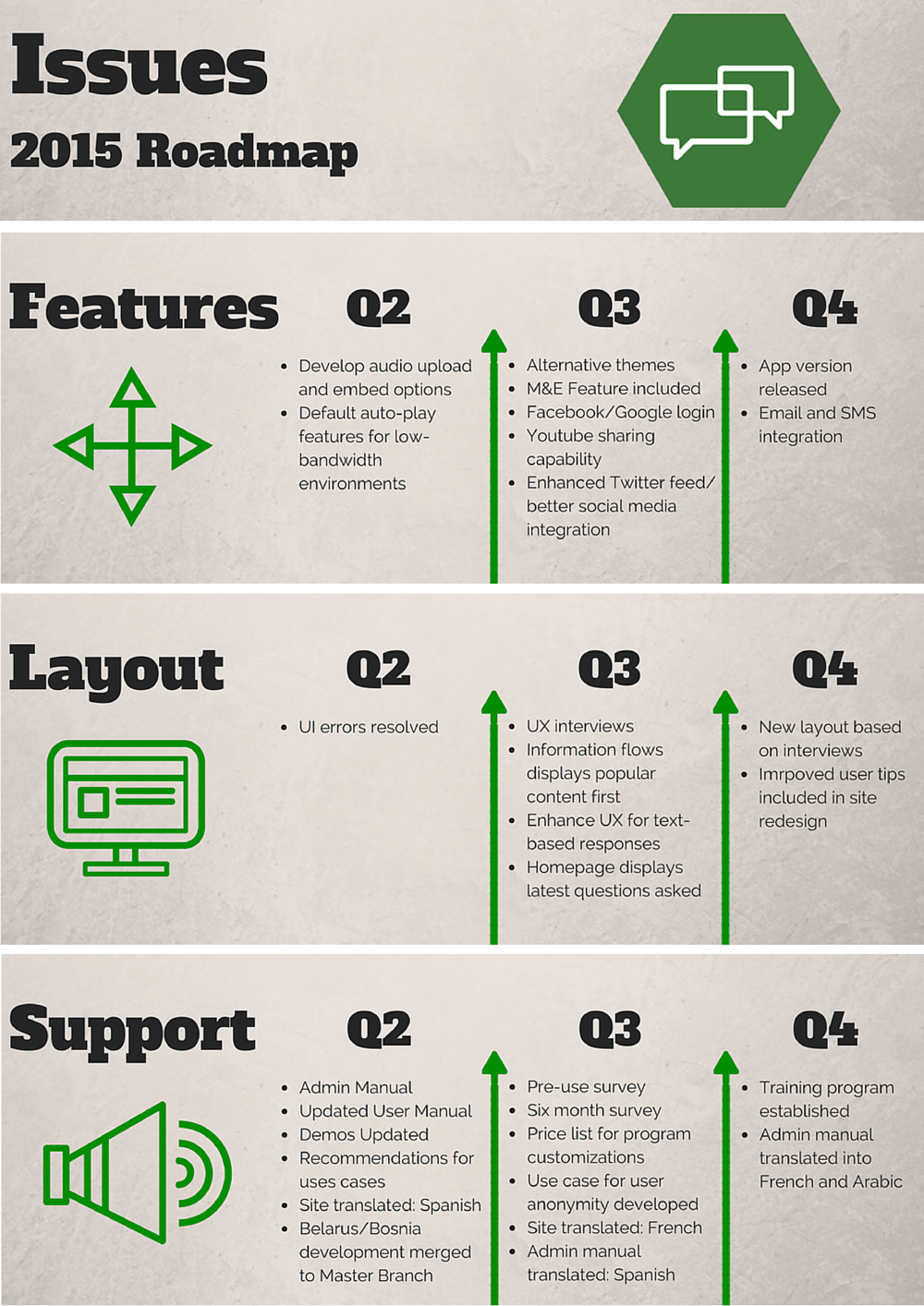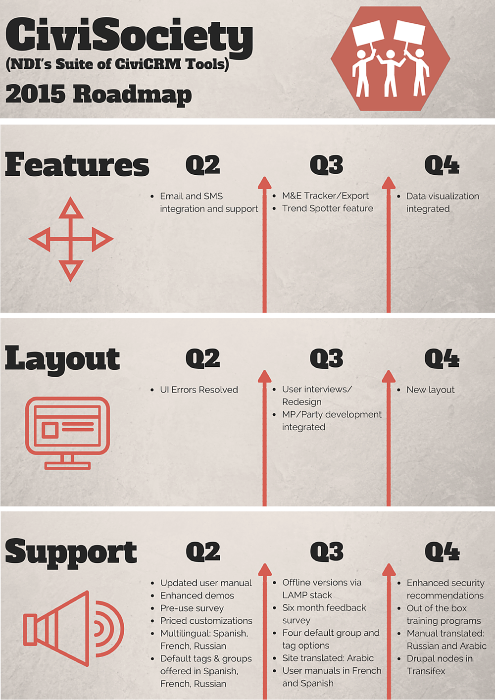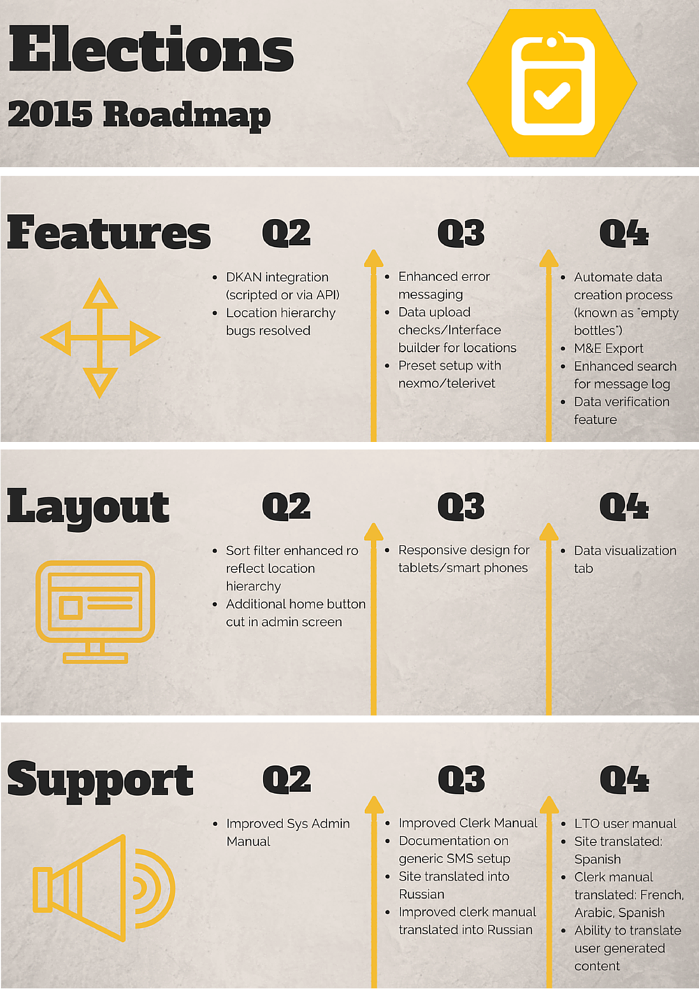 As we better understood the gaps between our vision for the tools and how they function in practice, and looked closely at stakeholder feedback and user reviews, a plan began to take shape with a renewed vision: DemTools 2.0. We reviewed all potential development options, took a hard look at funding sources, and cut zealously any work that wasn’t central to our product vision. Three key priorities – better support, enhanced multilingual capacity and increased usability – focused our decisions on what features should be developed over the next three quarters. The end result is a development timeline that will require steadfast focus to execute, but will leave our tools more stable, better supported and better able to meet the challenges of democracy and the needs of our partners in the field. We thank everyone who piloted DemTools and provided feedback on bugs and challenges, for their part in developing a roadmap for DemTools 2.0.