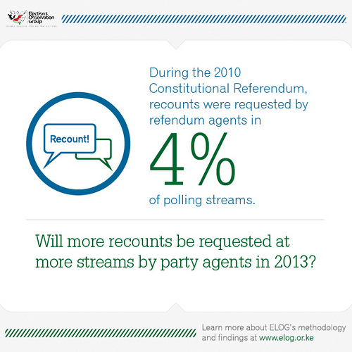 In 2010 ELOG systematically monitored the Kenyan Constitutional Referendum by deploying observers to a random sample of polling stations across the country. The observers rapidly reported their data via SMS back to a central data center so ELOG could evaluate how the election was going in near real-time.